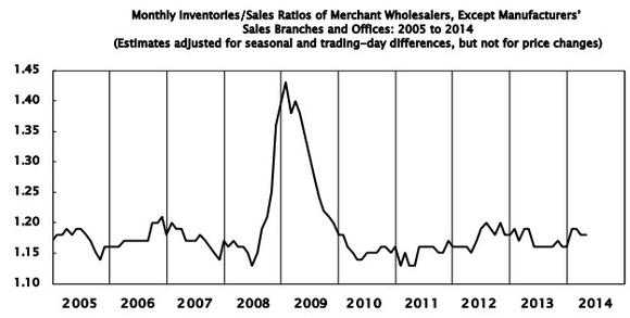 To understand the rate at which goods are being made and sold, economists compute an inventories/sales ratio. Since sales and inventories both increased relatively similar amounts from March to April, the inventories/sales ratio stayed steady at 1.18, just 0.01 points above the April 2013 ratio.
