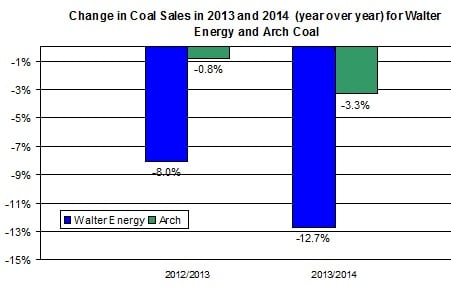 Walter Energy expects a decline in its coal sales from 12.6 million metric tons of coal in 2013 to nearly 11 mmt in 2014 -- a 13% fall. Most of this drop is due to an expected 18% plunge in metallurgical coal production.