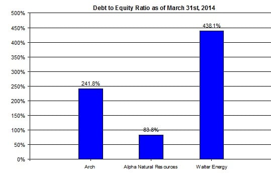 Keep in mind, however, that Walter Energy mostly sells metallurgical coal (roughly 90% of its coal output), which is mostly used to smelt iron ore. Meanwhile, Arch Coal's metallurgical coal business accounts for only 5% of its total coal volume -- most of its operations are in thermal coal. Alpha Natural Resources is in the middle of the pack, as met coal accounts for roughly 50% of its volume of coal produced. Since metallurgical coal prices took a much harder hit than thermal coal, the current market conditions are much harsher for Walter Energy than they are for Arch Coal or Alpha Natural Resources.