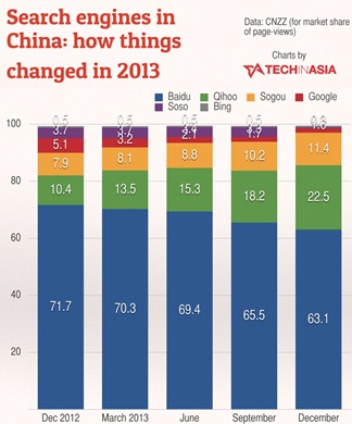 The Internet penetration level in China is around 42%. This is expected to increase in the next few years, as the country's Internet user base is set to grow to 800 million by 2015, translating to approximately 60% penetration. Baidu's market share was around 63.5% as of December 2013, compared to a 71% market share back in 2012.