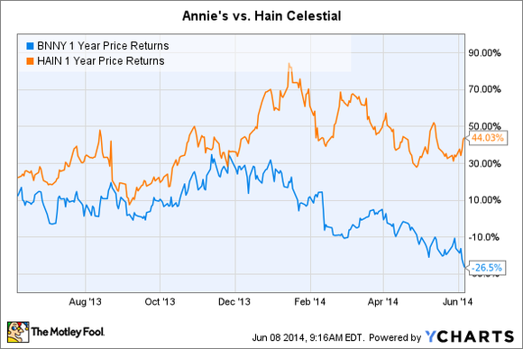 For all the risk, you'd think that Annie's would at least offer a bargain, right? Not so. The stock is trading at a forward earnings multiple of 31.2%. The P/E ratio is competitive with that of rival Hain Celestial (HAIN 2.11%), which trades at a forward earnings multiple of 29.4. But Hain's premium is warranted, the company coming off a record third quarter for net sales of $557.4 million and a 22% jump in adjusted diluted earnings per share. It also lifted its fiscal 2014 net sales and earnings per share guidance in response to its recently finished acquisition of Rudi's Organic Bakery and better-than-expected quarterly results so far this year.