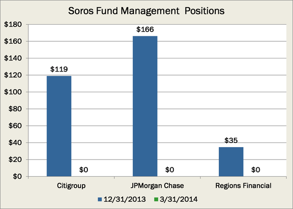 In the last quarter of 2013 we learned Soros Fund Management had bought a total of $320 million worth of Citigroup (C +1.29%), JPMorgan Chase (JPM +0.92%), and Regions Financial (RF 0.21%). Yet the opinion on those banks must've changed quickly, as by the end of March, all three had been sold off: