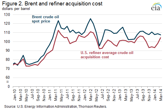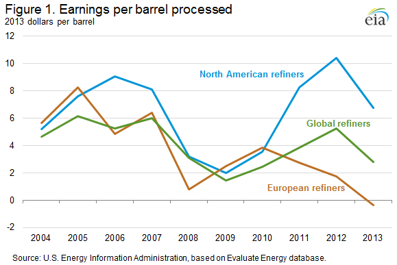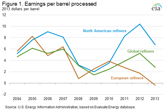 The report found that refining profitability across the three groupings tended to move together during the 2004-2010 period. European and North American refineries benefited from a broad increase in gasoline and distillate prices from 2004 to 2006, with profitability falling during the 2008-09 financial crisis. However, as the global economy recovered after 2010, many North American refineries benefited from relatively lower prices for two key inputs: crude oil and natural gas. Increasing production of both crude oil and natural gas contributed to lower feedstock costs in North America compared to international prices.