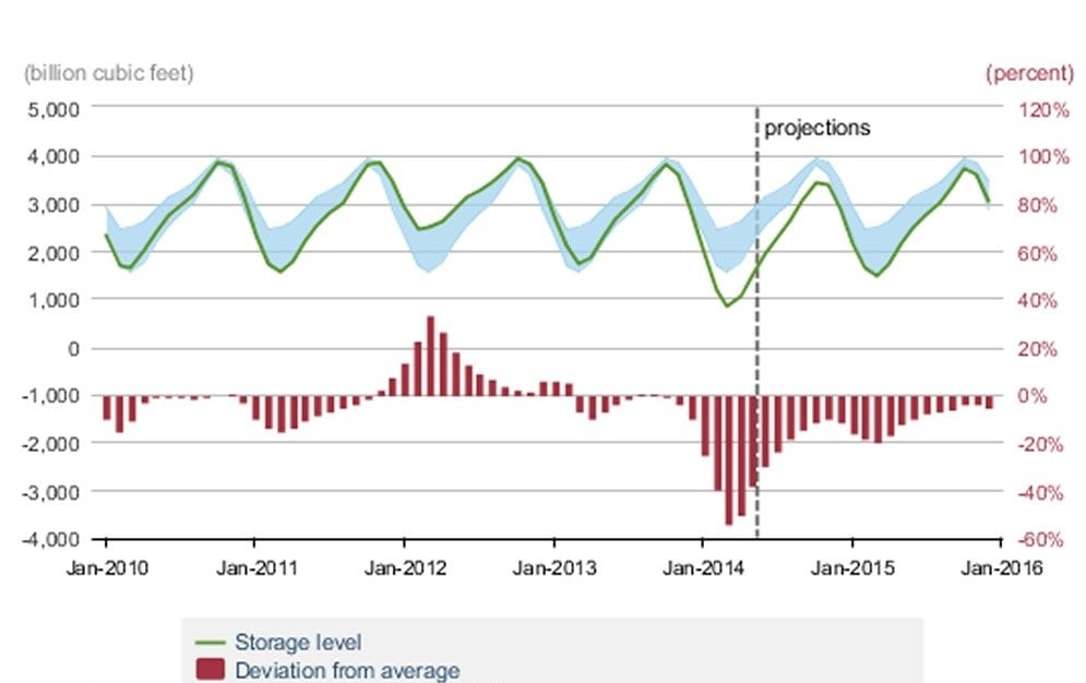 In addition, the EIA predicts near normal winter weather for 2015: "In 2015, total natural gas consumption falls by 0.2 Bcf/d as a return to near-normal winter weather contributes to lower residential and commercial consumption."