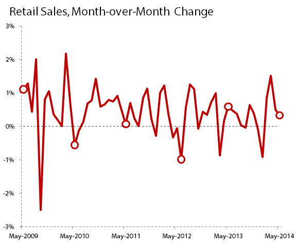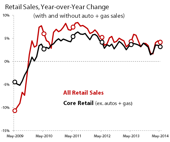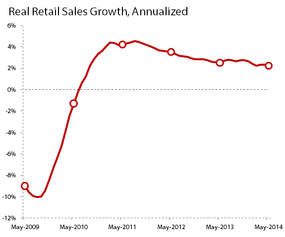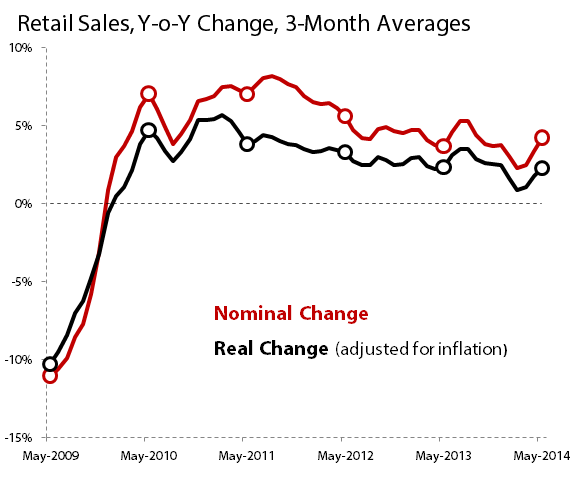 While we're on the subject of inflation, let's look at how overall retail sales have grown once inflation is taken into account. To smooth out the month-to-month noise, we'll use a rolling three-month average year-over-year growth rate -- that is, we'll compare the average of retail sales from this March, April, and May to the average of sales from those three months in 2013: