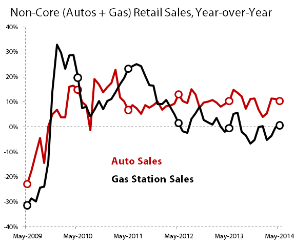 The gas-station component of noncore retail, which was once one of post-crash retail's fastest-growing sectors, has since slipped into persistent declines, posting year-over-year growth in excess of 1% on a nominal basis in only two of the past 12 months. Since retail sales reports don't account for inflation, this means that retail-level gas sales have essentially been in decline for a year. This doesn't jibe very well with auto sales, which have posted year-over-year growth rates of 5% or greater in all but one of the past 12 months and have grown 10% or more year over year for eight of the past 12 months: