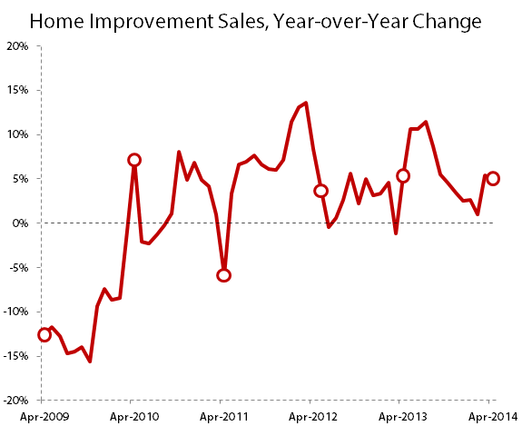 The only segment other than auto dealers to post a month-over-month growth rate in excess of 1% was building-and-garden-supply retailers, which is most prominently represented by home-improvement chain and Dow component Home Depot (HD +0.41%). Even this positive bit of sector news wasn't enough to boost Home Depot, which lost 1.7% of its value today. Home-improvement retail grew 4.6% on a year-over-year basis, which seems like a good clip until you realize that it's well below last summer's heady growth rates. There is still time for this sector to rebound and recapture those growth rates, though: