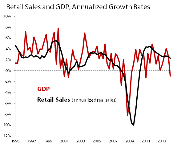 As you can see, GDP usually leads retail sales by a quarter or two, and since retail sales figures are updated on a monthly basis as compared to the quarterly updates to GDP, we might be get some insight into the American economy between GDP updates by examining real annualized retail sales growth. On this measure, at least, it appears the economy isn't about to stall out just yet: