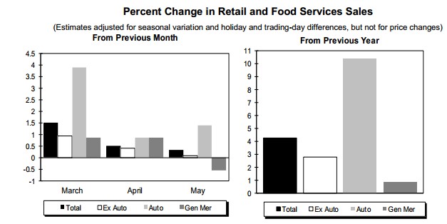 Retail and food services sales increased a seasonally adjusted 0.3%, to $438 billion for May, according to a Commerce Department report (link opens as PDF) released today.