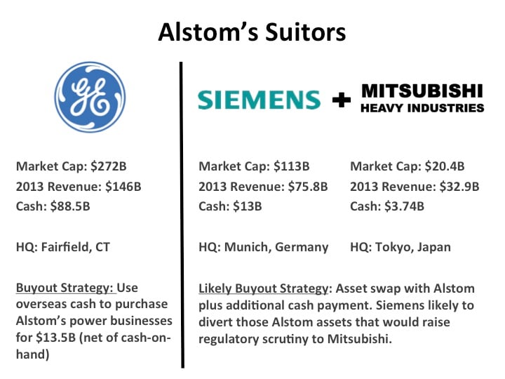 For perspective, I pulled together some relevant stats on the suitors who are currently involved in the contest for Alstom. I've also included my thoughts on the likely buyout strategy to be employed by Siemens and Mitsubishi Heavy Industries: