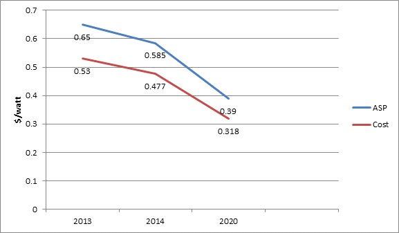 Prices are also expected to go down in the years to come. Demand is definitely increasing, but companies are also increasing their capacity. This will lead to a lower ASPs in 2014 and beyond. GTM Research expects the ASP to fall to $0.36 per watt by 2017, it is currently around $0.60-$0.70 for a commodity solar panel. IHS believes that the average selling prices will go down by 10% this year, due to persistent manufacturing overcapacity. The long-term projection of prices and costs by IHS predicts a 40% decline by 2020.