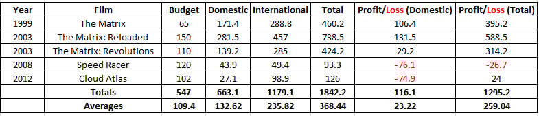 That haze has never let up. The pair's follow-up movie Speed Racer crashed and burned in the summer of 2008. Based on the classic cartoon series, the film was described as a psychedelic mind-trip that stalled out at the starting block, before international audiences helped cut the loss. 2012's Cloud Atlas netted a similar result and that was with Tom Hanks and Halle Berry in lead roles.