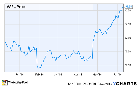 For the sake of a smooth transition, the prices on this chart prior to the split have been adjusted to the post-split share count (by dividing by seven). As you can see, the stock was up more than 20% in the past three months prior to the split. This climb makes sense because lots of people want to buy before the split happens expecting that the split will lead to a rise in share price.