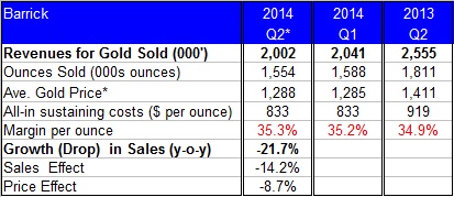 The table below shows the expected changes in Barrick Gold's revenue in the second quarter compared to same quarter last year.
