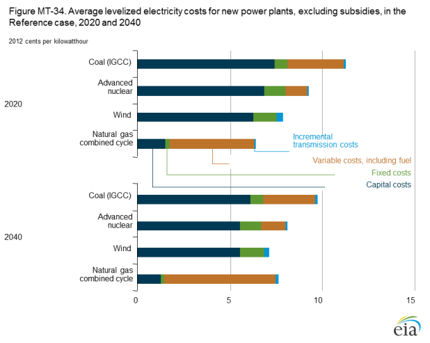 The news was not good for coal. Existing policy, including MATS, made for forbidding initial capital costs. This was exasperated by high fuel costs, making it the most expensive form of electricity in 2020 and 2040, according to the study (which also examined natural gas, nuclear, and wind.) The result is that predicted coal plant construction is nonexistent going forward.