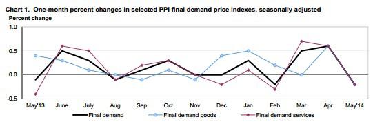 The Producer Price Index (PPI) for final demand fell a seasonally adjusted 0.2% for May, according to a Labor Department report (link opens as PDF) released today.