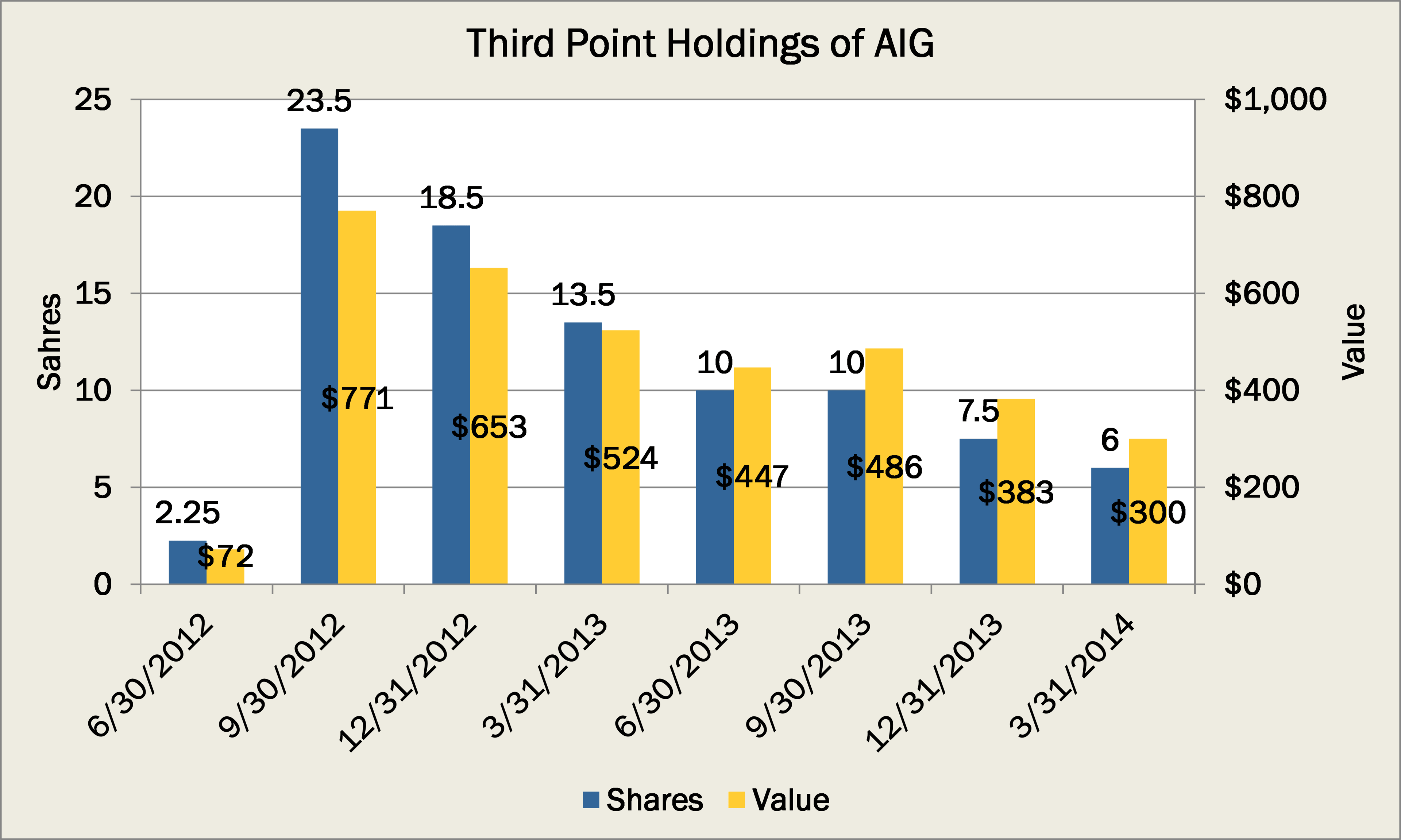 In the fall of 2012, Third Point bought 23.5 million shares of AIG, which at the time were worth $770 million. In the quarterly letter outlining why the investment was made, the fund stated that as the U.S. Treasury continued to unload its position in the bailed out-insurer, it was able to "purchase AIG at a discount to intrinsic value."