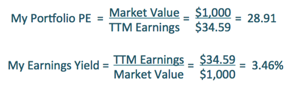 In the end, the two charts above took a mere 30 minutes to pull together, yet they produced a highly valuable x-ray of my holdings. Using this information, I was able to assess my portfolio's price-to-earnings (PE) ratio and earnings yields quite easily: