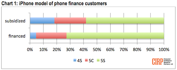 According to new survey results released by Consumer Intelligence Research Partners, or CIRP, the exact opposite is happening. The figures are based on a survey of 1,500 respondents between July 2013 and March 2014. CIRP finds a considerable shift toward higher-priced iPhones when purchased under interest-free financing plans. The flagship iPhone 5s grabs 73% of financed iPhone sales, compared with 61% of subsidized iPhone sales.