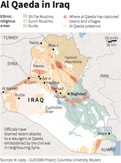 On June 10, the Islamic State of Iraq and Syria surprised and overwhelmed Iraqi security forces in Mosul, the country's second-largest city. ISIS drove out the security forces and government buildings were taken over. The situation prompted Prime Minister Nouri Al-Maliki to declare a nationwide state of emergency.