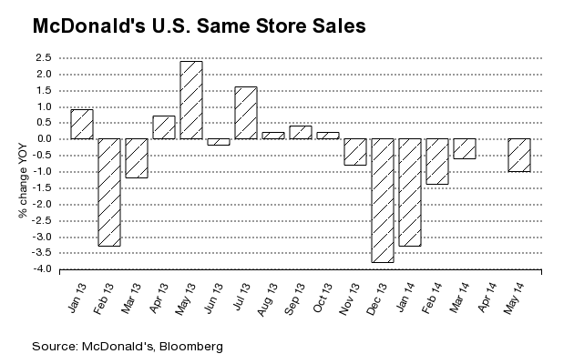 It's been a rough few months for McDonald's (MCD +2.47%) and its CEO Don Thompson. No matter what the company tries, it cannot reverse its declining U.S. sales numbers. For the month of May, McDonald's saw its U.S. same-store sales drop 1%. This marked the seventh consecutive month of disappointing same-store results.