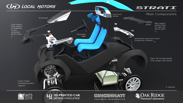 In a testament to the power of crowd-sourcing and the amazing creativity that can be found all over the globe, Local Motors, a crowd-sourced vehicle manufacturer, received more than 200 entries from over 30 countries to the design challenge that it held for the 3-D printed EV. Earlier this month, a panel of six judges selected the Strati -- which brings to mind the love child of a sleek sports car and rugged dune buggy -- as the overall winner. Designer Michele Anoe of Italy won $5,000 and the opportunity to see the vehicle that will be highly inspired by his design printed at the IMTS.
