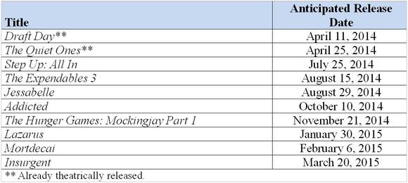 Lions Gate has a promising pipeline scheduled for its fiscal 2015, including a new Hunger Games movie expected to be launched this November. Divergent produced more than $250 million in global box office receipts, and this bodes well for Lions Gate as the company builds that franchise for the years ahead.