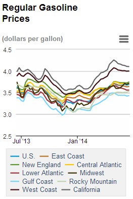 The national average price for regular gasoline clocked in at $3.686 per gallon, up $0.012 from a week ago and $0.060 above the same time last year. While every region saw a gas price increase this past week, the Rocky Mountain region experienced the largest gain ($0.023). The West Coast made out with the smallest weekly increase, up just $0.004 per gallon.