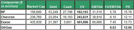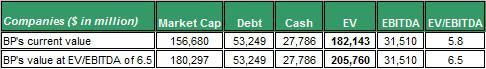 Moreover, the current oil and gas average EV-to-EBITDA ratio is around 6.5. If BP's value was increased to this average, assuming all else equal, the company's market cap would reach more than $180 billion. The table below shows the gap difference between the two valuations.