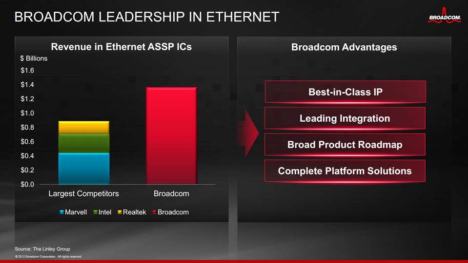 Broadcom is the world leader in Ethernet switches and network interface card ("NIC") silicon with industry-leading market share.