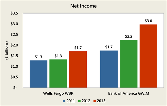 At last count, the Global Wealth & Investment Management (GWIM) business of Bank of America had staggering $2.4 trillion in assets under management and delivered nearly $3 billion to the bottom line of the bank in 2013. Competitor Wells Fargo (WFC +0.56%) also has a massive Wealth, Brokerage and Retirement (WBR) business with $1.4 trillion in assets that netted it $1.7 billion last year.