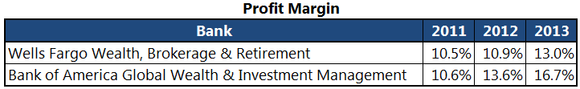 As you can see, the two were roughly equal in 2011, but over the last two years Bank of America has been able to expand its margin by more than 6 percentage points, which is 2.5 times higher than the gain by Wells Fargo. All of this is to say the Global Wealth & Investment Management business at Bank of America hasn't just been adding to its top-line revenue and other metrics, but it too has been able to expand its profitability in a staggering way.