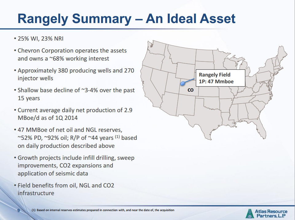One recent example of this was Atlas Resource Partners' acquisition of a 25% nonoperating interest in the Rangely Field in Colorado. Atlas Resource Partners is spending $420 million for a mature low-decline carbon dioxide flood project. As the following slide notes, this is an ideal asset for an MLP like Atlas Resource Partners.