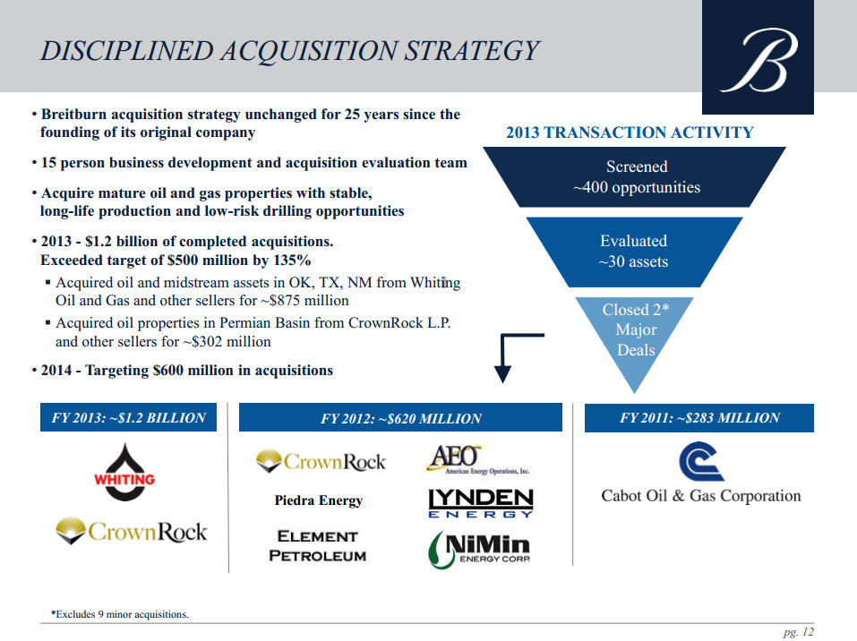 BreitBurn hasn't been having the best of luck with its most recent acquisitions. The company ran into problems integrating its last two deals as the sellers left the assets in less than ideal conditions upon handing them off to BreitBurn. Because of that the company had to scramble to find supplies to keep the oil flowing, which had an impact on the company's production the last couple of quarters. That being said, the company does have a very disciplined approach to acquisitions as the following slide shows.