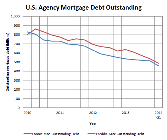 But looking only at demand for mortgage-backed securities gives you only half of the story. Interestingly, the supply of mortgage-backed securities has also fallen lately. Data from the Securities Industry and Financial Markets Association show that Fannie Mae (FNMA 4.46%) and Freddie Mac (FMCC 1.13%) have both dramatically reduced the amount of mortgage-backed debt they have outstanding, likely as part of their ongoing process of winding down in conservatorship.