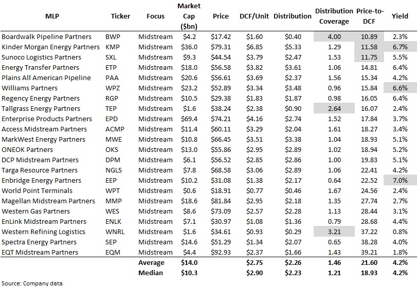 Highlighted are the best three partnerships in each category of distribution coverage, unit price-to-DCF, and yield. While higher yields may be tempting, I prefer the coverage ratio as my favorite metric for two reasons. First, a partnership that can cover its distribution is more likely to increase the payout and less likely to issue more units. Second, a partnership with a high coverage ratio is a more attractive target because its cash flow can help support a lower coverage ratio at another partnership.