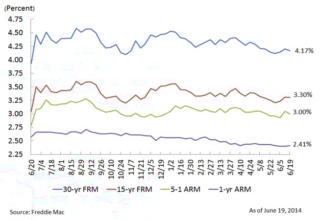 5/1 adjustable-rate mortgages (ARMs) showed the week's biggest change in price, falling five basis points to 3.00%. 1-year ARMs, in contrast, inched up a single basis point to 2.41%. A year ago, 5/1 ARMs were at 2.79%, and 1-year ARMs at 2.57%.