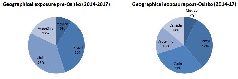 The acquisition of Osisko will increase Yamana's North American exposure, and specifically exposure in Canada which is historically a mining-friendly region. As of now, all of its North American production (9% of total) comes from Mexico. After the Osisko acquisition, Yamana's North American production will increase to 21% of the total production (2014-2017), of which 14% will come from Canada.