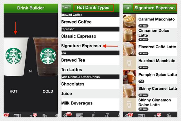 Source: Author's screenshot, red areas and boxes added to show my choices. (left) Choose your drink, hot or cold; (middle) choose the drink category; (right) select or check out a specific drink from the category you chose.