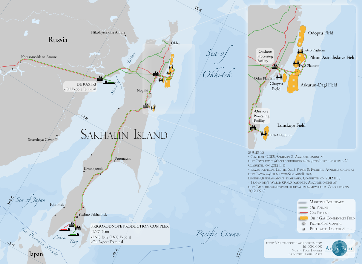 Sakhalin Island is a large island that is located to the north of Japan and just off of the east coast of Russia.