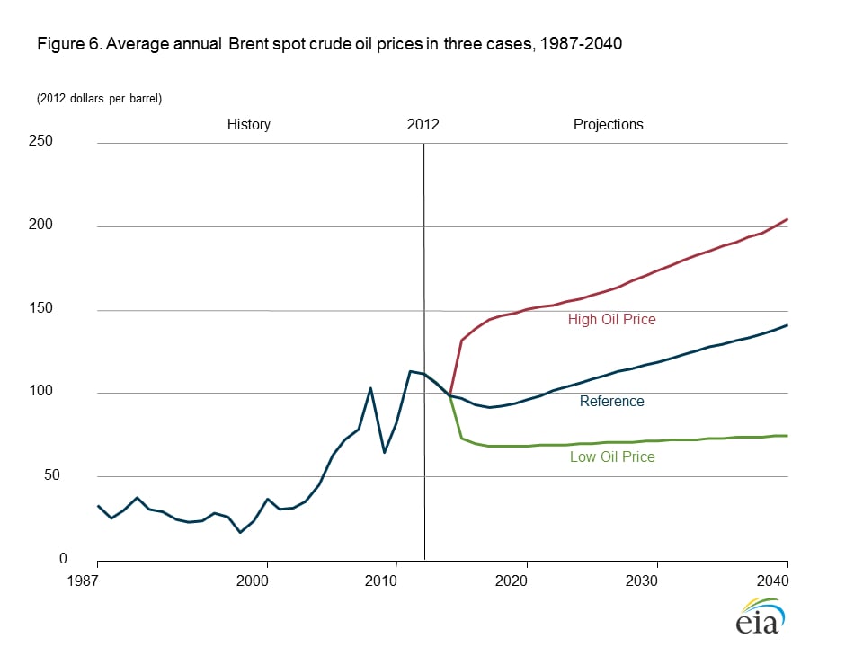 The current volatility is in line with the EIA's predictions. The EIA estimated that oil prices will bounce around over the short-term but as the chart below indicates, oil prices will rise over the long term in a slow and steady manner. The EIA predicts Brent crude oil prices to average $108/bbl in 2014 and $102/bbl in 2015 with the WTI discount to Brent to averaging ~$9/bbl and $11/bbl in 2014 and 2015, respectively.