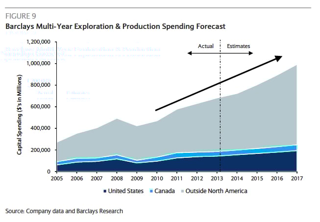 Even though the major producers have stated they are reducing spending in 2014, the global picture is still robust. Regions outside North America are expected to create the "lion's share" of opportunities moving forward. Leading the way in E&P spending is the Middle East as this region is expected to grow by more than 14% over the short term. Other strong regions are Latin and South America, which are expected to grow by 13%, and growth is expected to increase by ~11% in Russia. So, looking forward, the major oil and gas service companies that have significant global branches have good reason to be very optimistic.