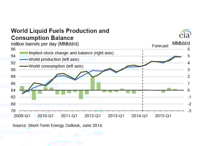 According to the EIA, global consumption increased by 1.2 million bbl/d in 2013. The organization is expecting global consumption to grow at a similar pace this year and increase to 1.4 million bbl/d in 2015.