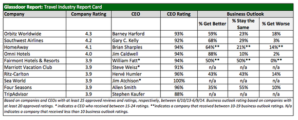 Hotels, booking and review sites, and a lone airline made the list of top travel-sector employers in the 2014 Glassdoor Travel Industry Report Card. The career site compiled its list based on verified employee reviews submitted over the past 12 months, along with employee ratings of their companies' CEOs and their opinions on whether business will improve, decline, or hold steady for the next six months.