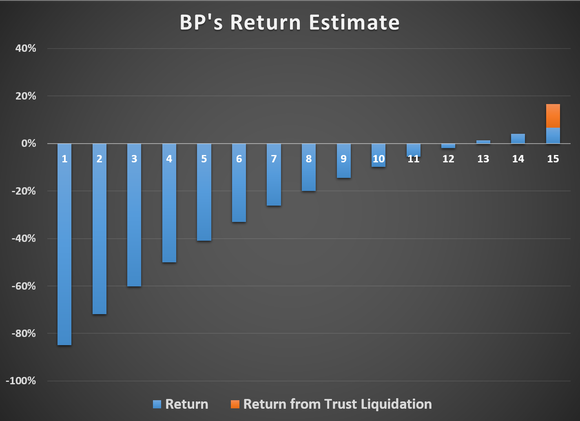 Let's go back to the BP Prudhoe Bay trust as an example again. A conservative payback period -- assuming 2% production decline and a 25% reduction in oil prices -- is still shorter than the current reserves to production ratio, so it's pretty safe to say that your investment will be paid back. However, by this estimate there are only a couple of years of distribution payments left afterwards, plus the residual payment, which is unknown. Assuming your residual value payment is 10% of your initial investment, which may be generous, here is what the return estimate would look like over the remaining life of the trust.