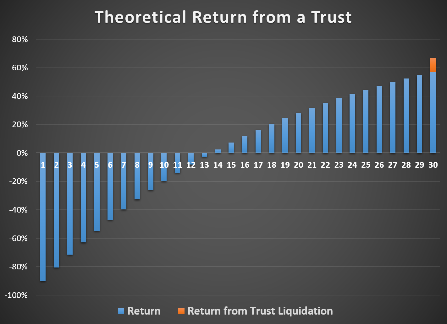 A better way to think of a royalty trust is like a unique bond. This is because royalty trusts don't buy new wells to keep the party going. Rather, a royalty trust has a finite life: its value slowly declines over time until it's no longer economically feasible to pull oil and gas from a well. Once the trust meets its terminal value, the residual value of the royalties are sold and distributed to unitholders. To help you better understand this, here is a chart of a theoretical return of a 30 year trust. In this case, it assumes uniform decline and constant commodity prices.