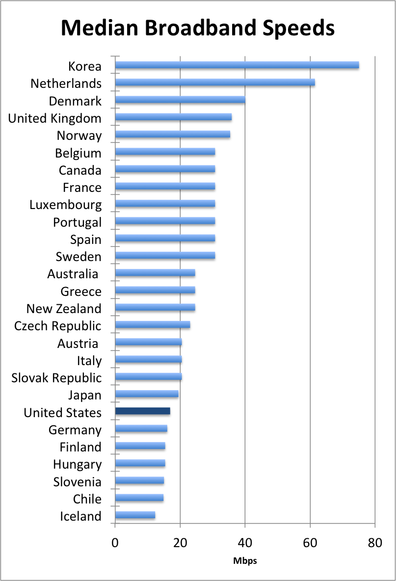 Slovakia may conjure up an image of dated Soviet-era buildings, but it offers a faster median broadband speed than in America. Greece, always seemingly embroiled in economic crisis, also beats America, as does the pastoral New Zealand, neighbor Canada, oft-criticized as too socialist France, and the old empire the United Kingdom. In fact, among the OECD countries, America comes in pretty far down the rankings in terms of broadband speed: