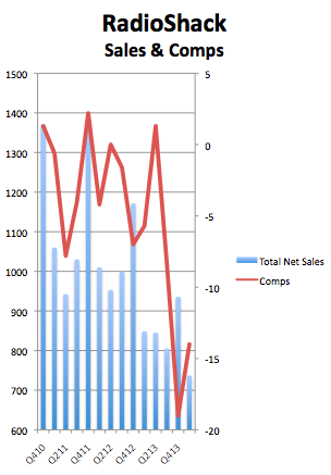 Earlier this month RadioShack reported earnings that show the monumental task confronting it. Revenues fell 13% to $736.7 million as comparable-store sales tumbled 14% from last year. Losses quadrupled year over year, hitting $98.3 million, or $0.97 per share, nearly double the $0.52-per-share loss analysts had been expecting. Limited by its lenders in how many stores it can close, the electronics store has had to dramatically scale back the planned closures from 1,100 to maybe 200.