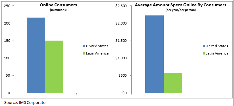 The United States boasts significantly more online consumers and higher e-commerce sales per person than in all of Latin America. Furthermore, Internet penetration is at least 10% higher in the United States than Latin American country .