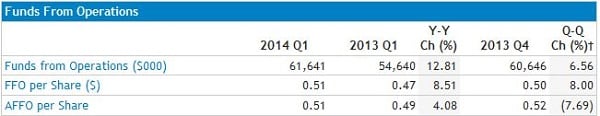 By law, a minimum of 90% of REIT taxable earnings must be distributed to shareholders. In the REIT sector, funds from operations, or FFO, is a key metric used to approximate cash-flow. FFO is basically net operating income adjusted by adding back depreciation expense and some amortizations. Simply put, FFO is the goose that lays the golden dividend eggs income investors are seeking.